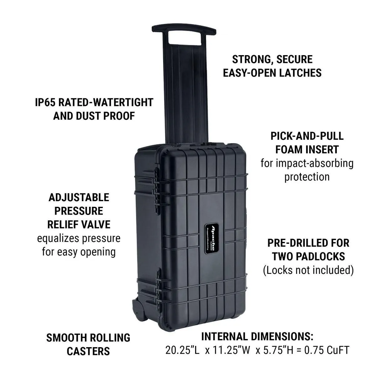 Protect your valuable gear with the Apache 5800 Weatherproof Protective Rolling Carry-On Case, built tough for travel, work, and outdoor conditions. This X-Large IP65-rated case is completely watertight and dustproof, keeping your equipment safe from the elements.