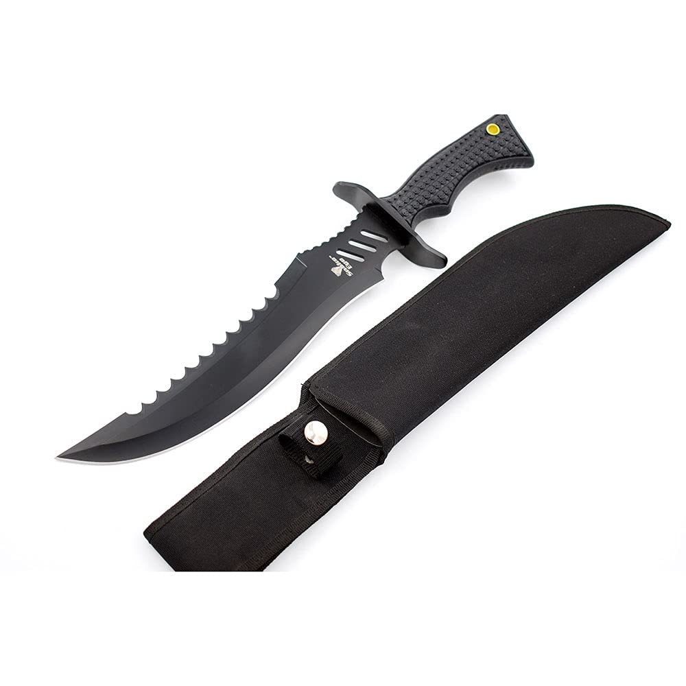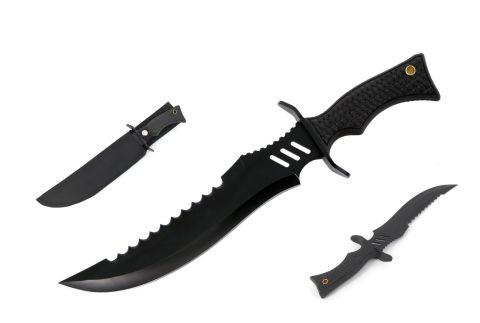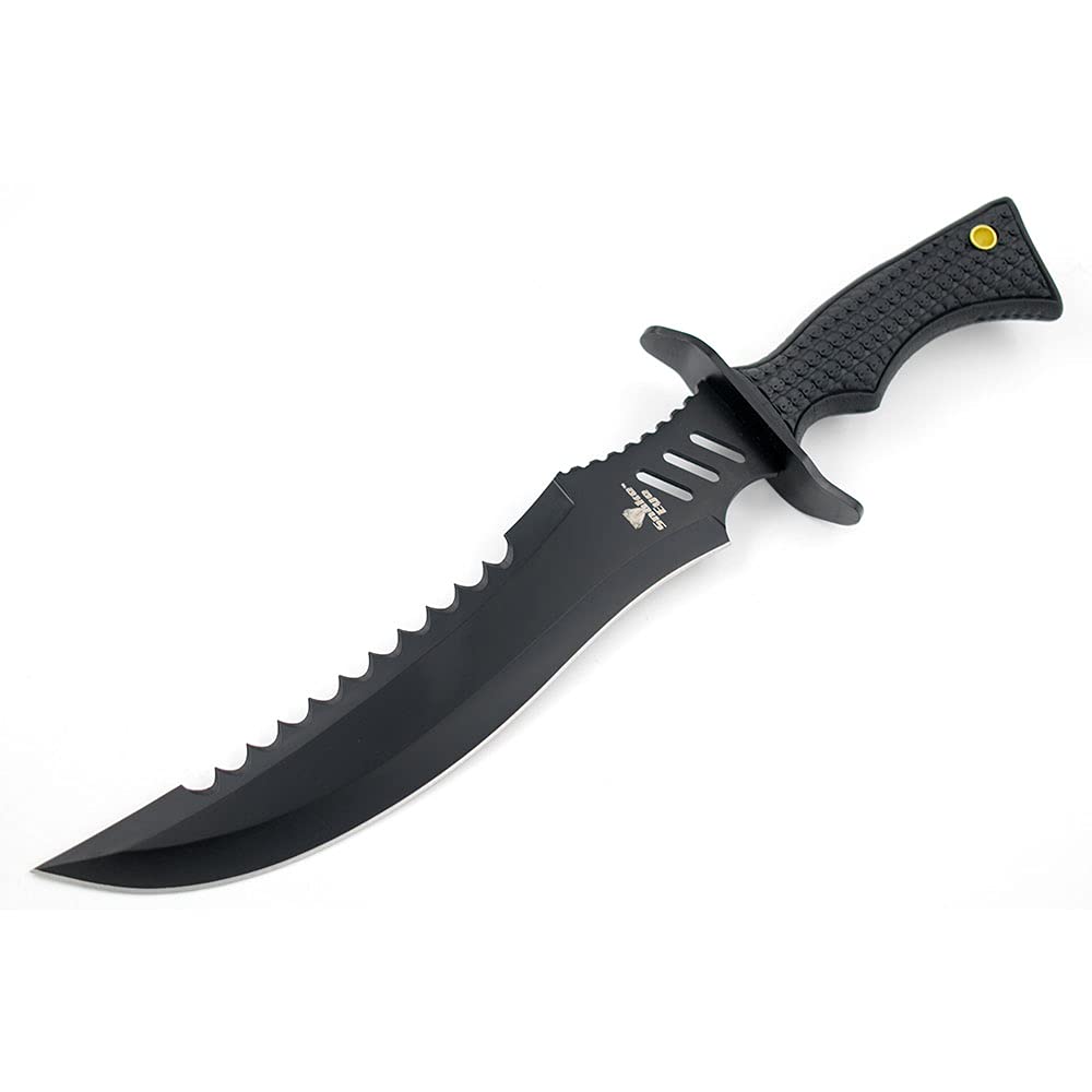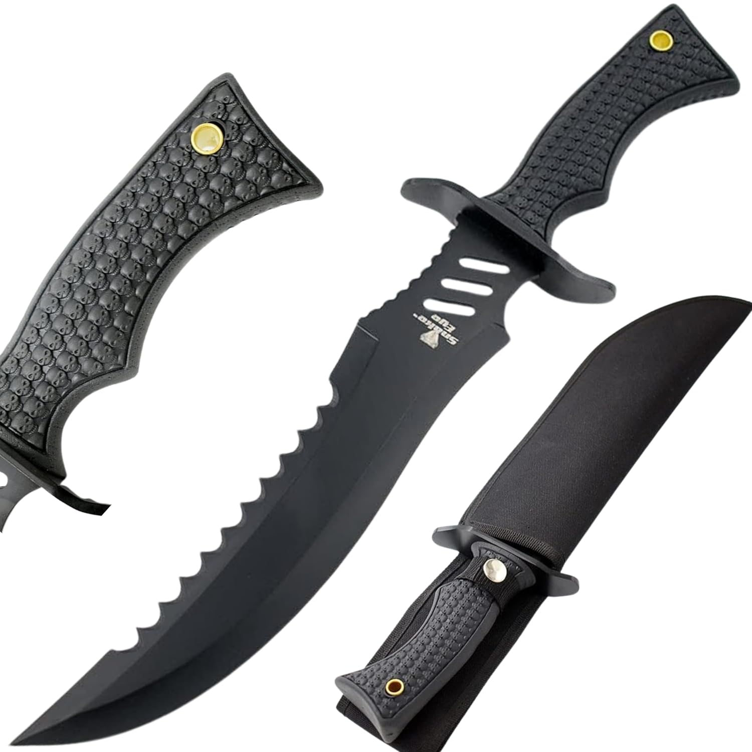Be prepared for any outdoor adventure with this 16″ Fixed Blade Hunting Knife Collection, designed for hunters, campers, survivalists, and collectors. This heavy-duty knife features a 10.5″ full-tang 440 stainless steel blade coated in sleek black for durability and corrosion resistance. The razor-sharp edge with a sawback spine provides versatile cutting power, making it ideal for chopping wood, clearing brush, field dressing, or emergency survival situations.