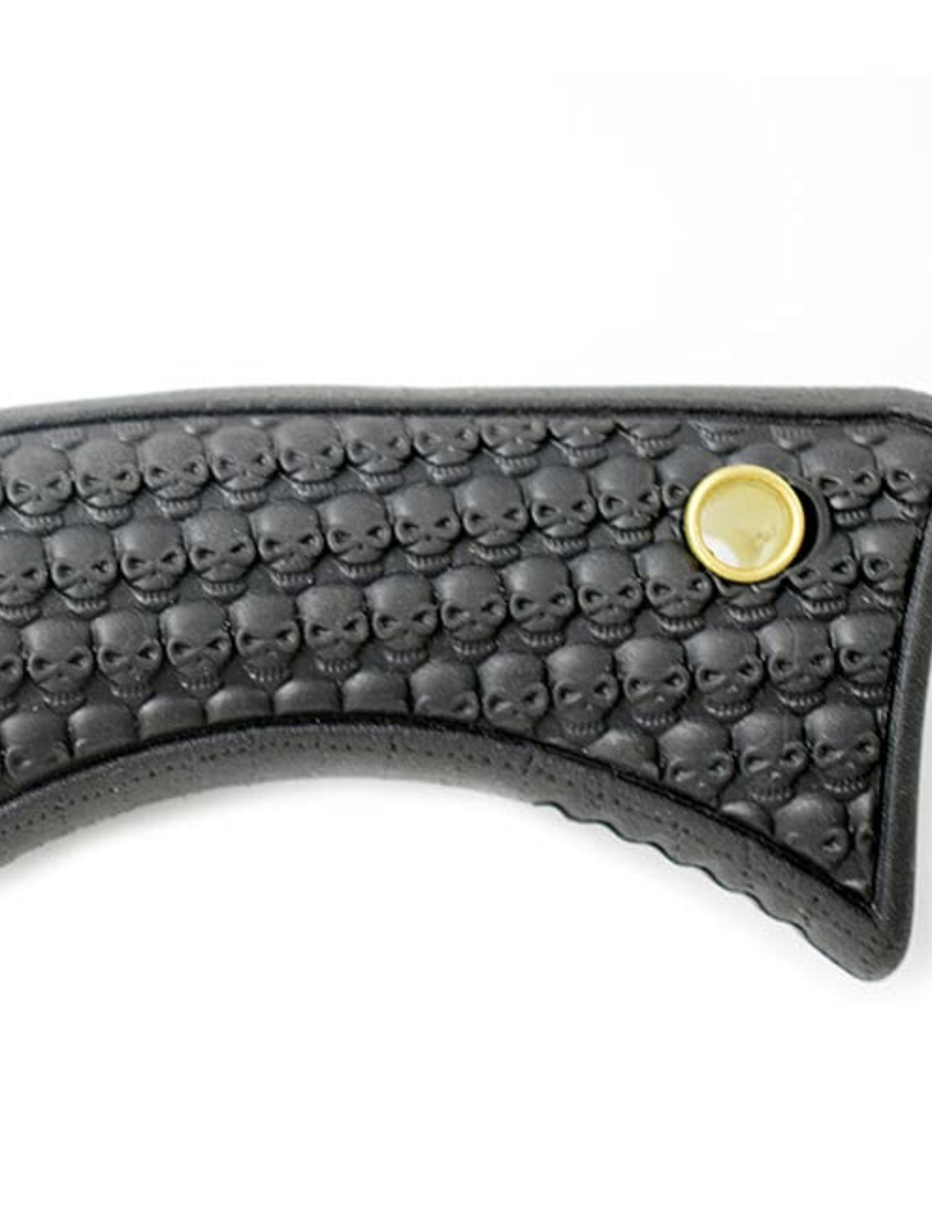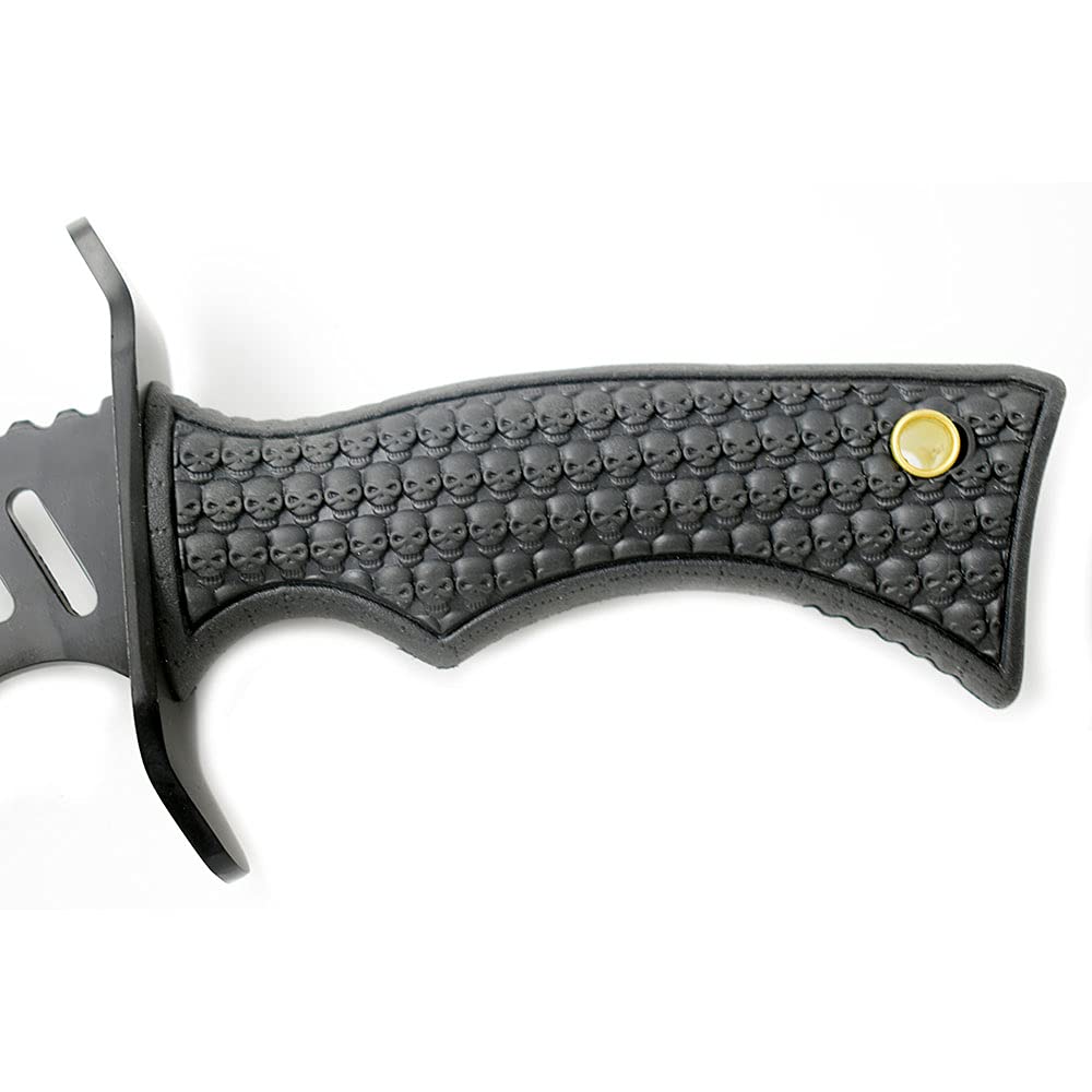 The handle is crafted with a textured black rubber grip for a secure, non-slip hold, even in wet conditions, and decorated with mini skull accents for a unique tactical look. Balanced for both strength and precision, this knife delivers reliable performance whether used for hunting, camping, fishing, hiking, or survival training.