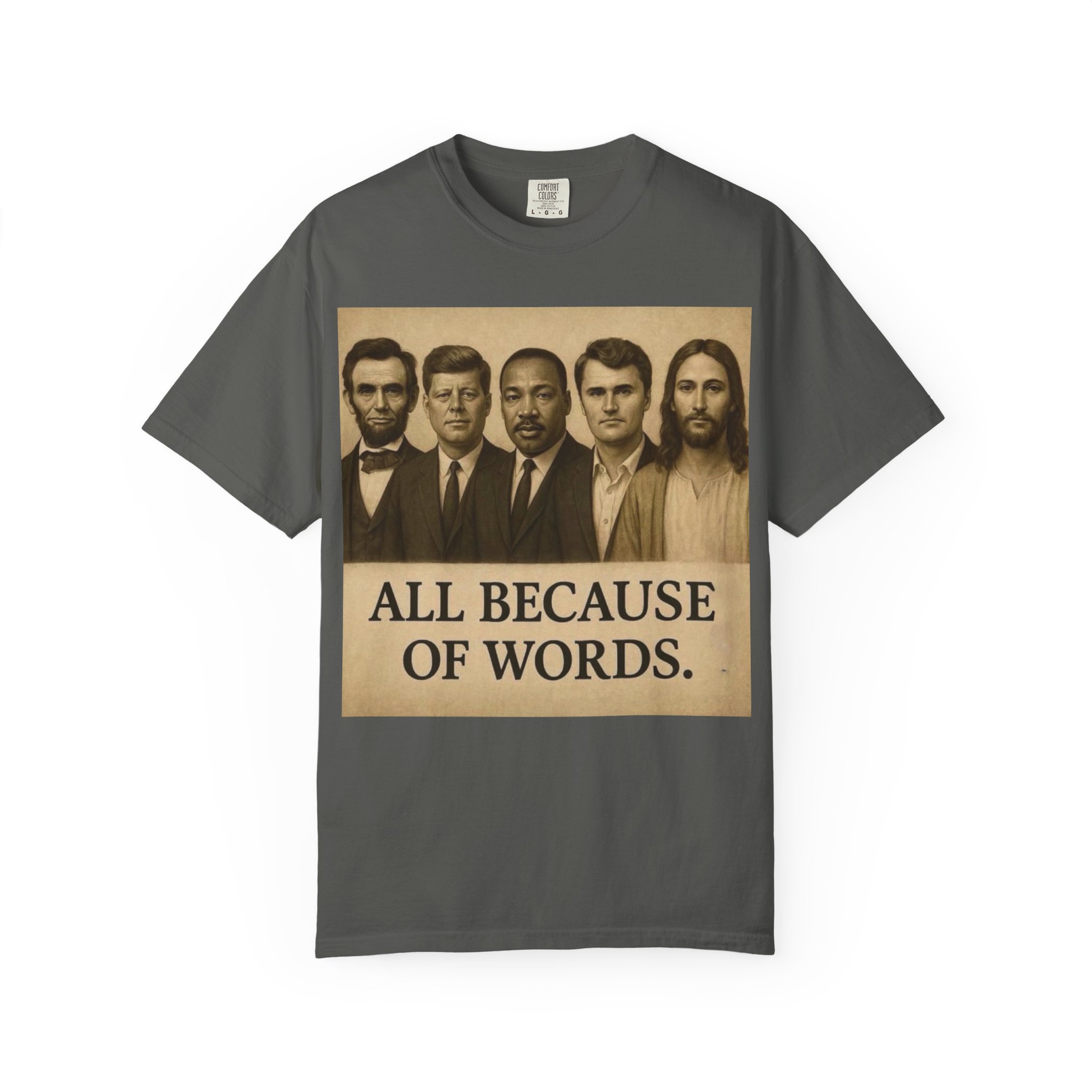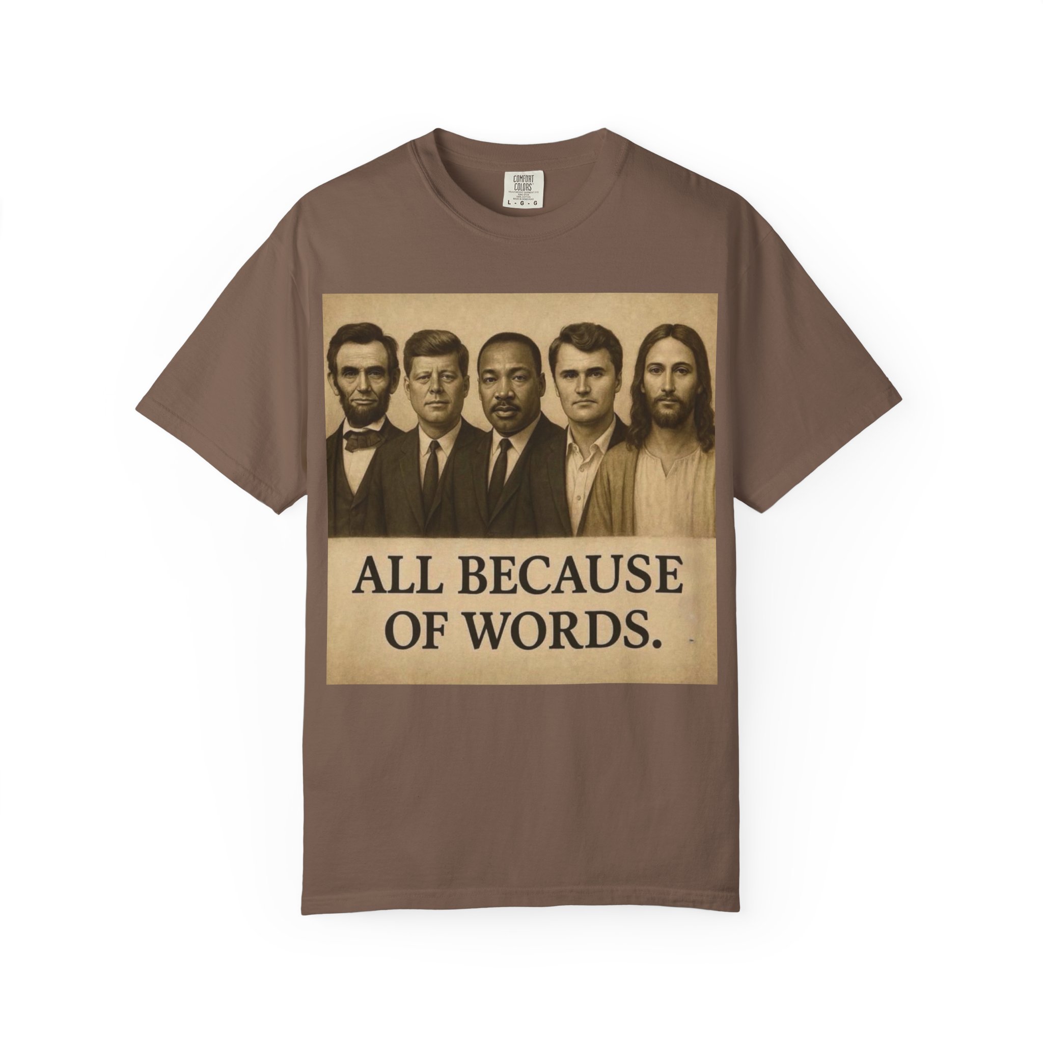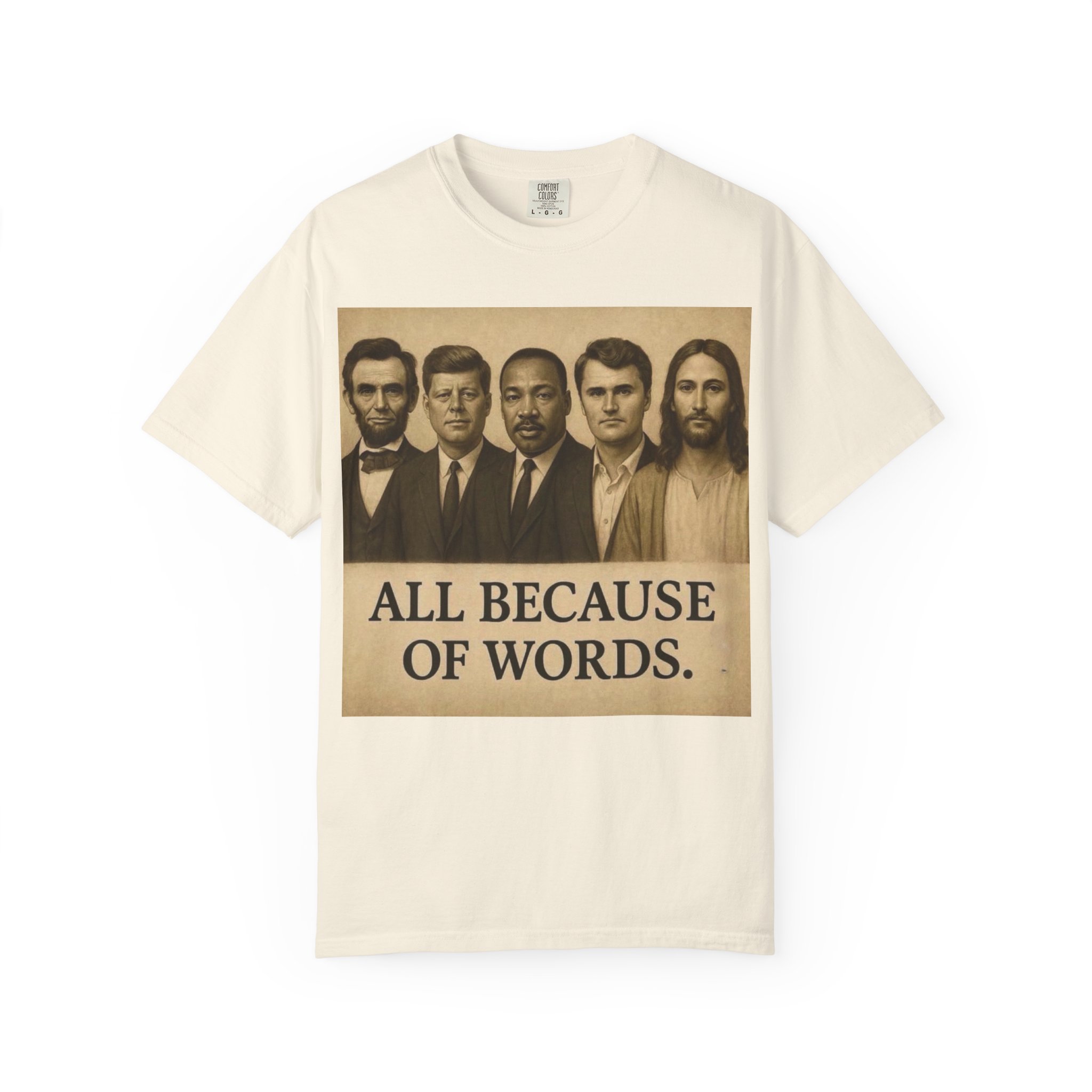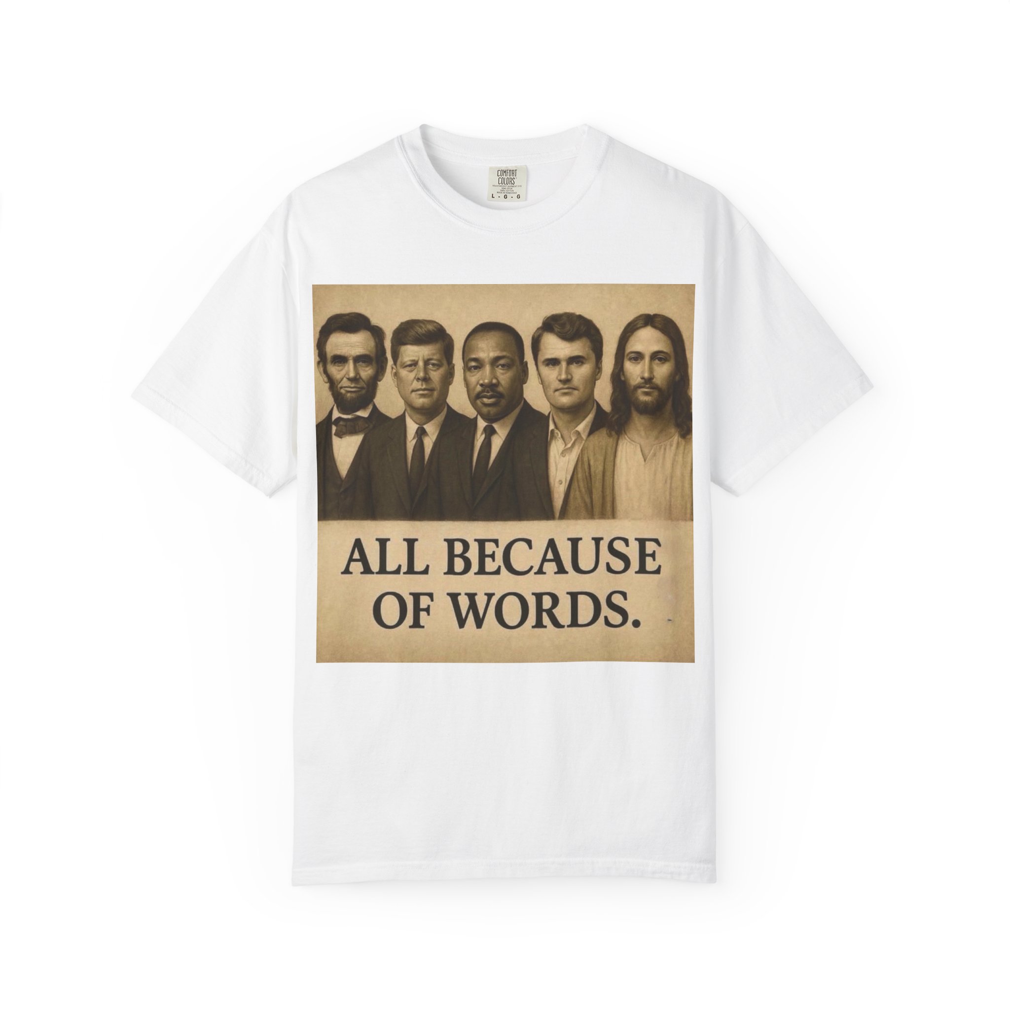 Make a bold statement with the “All Because of Words” T-shirt, designed for those who believe in the power of speech, truth, and leadership. Featuring a vintage-style sepia print with influential historical figures, this inspirational tee highlights the impact of words on history and culture.