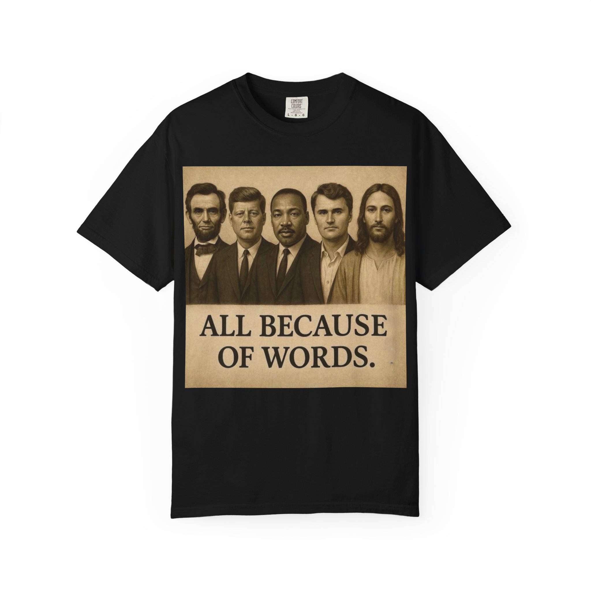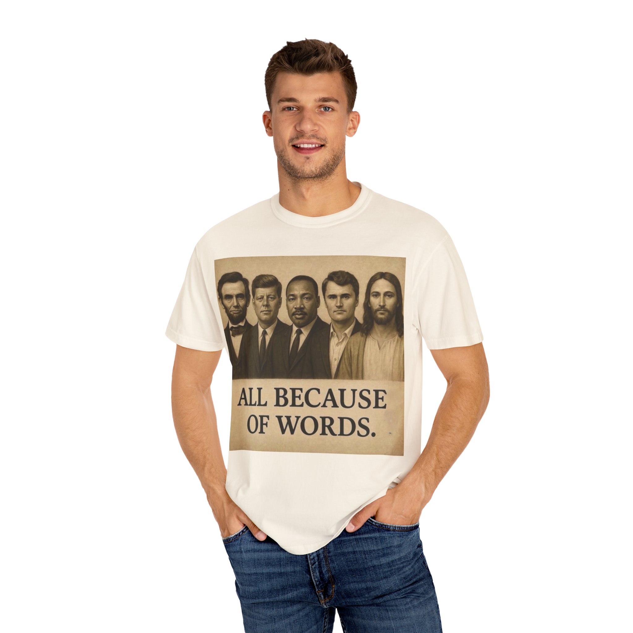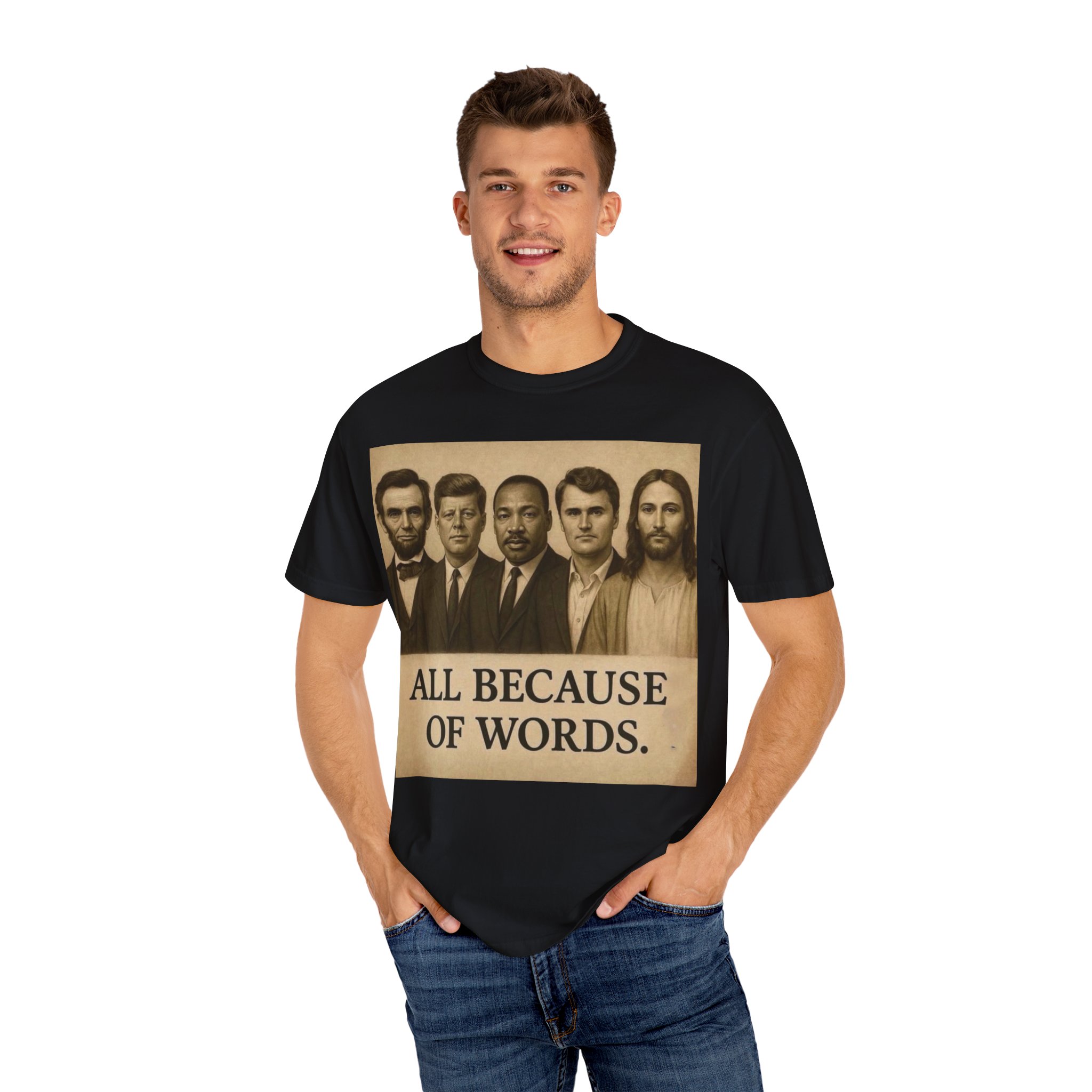 Make a bold statement with the “All Because of Words” T-shirt, designed for those who believe in the power of speech, truth, and leadership. Featuring a vintage-style sepia print with influential historical figures, this inspirational tee highlights the impact of words on history and culture.