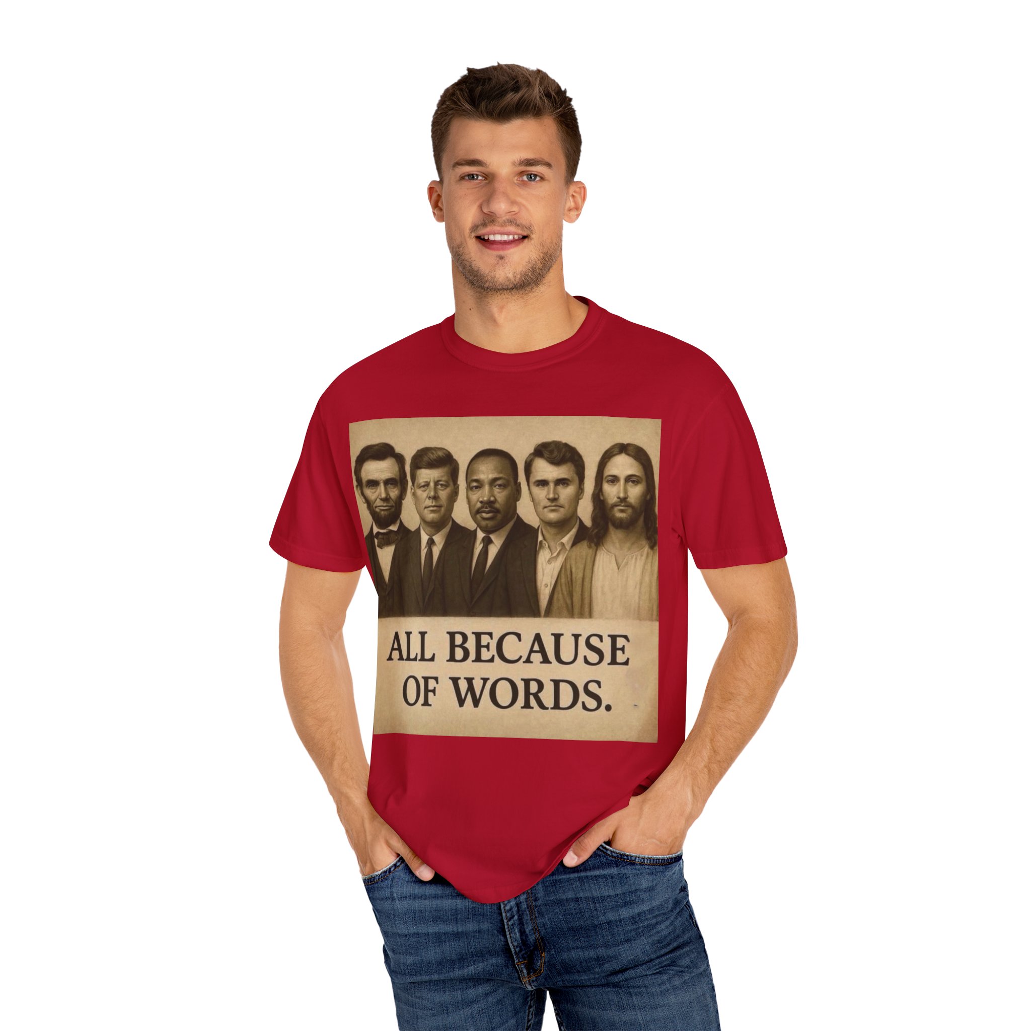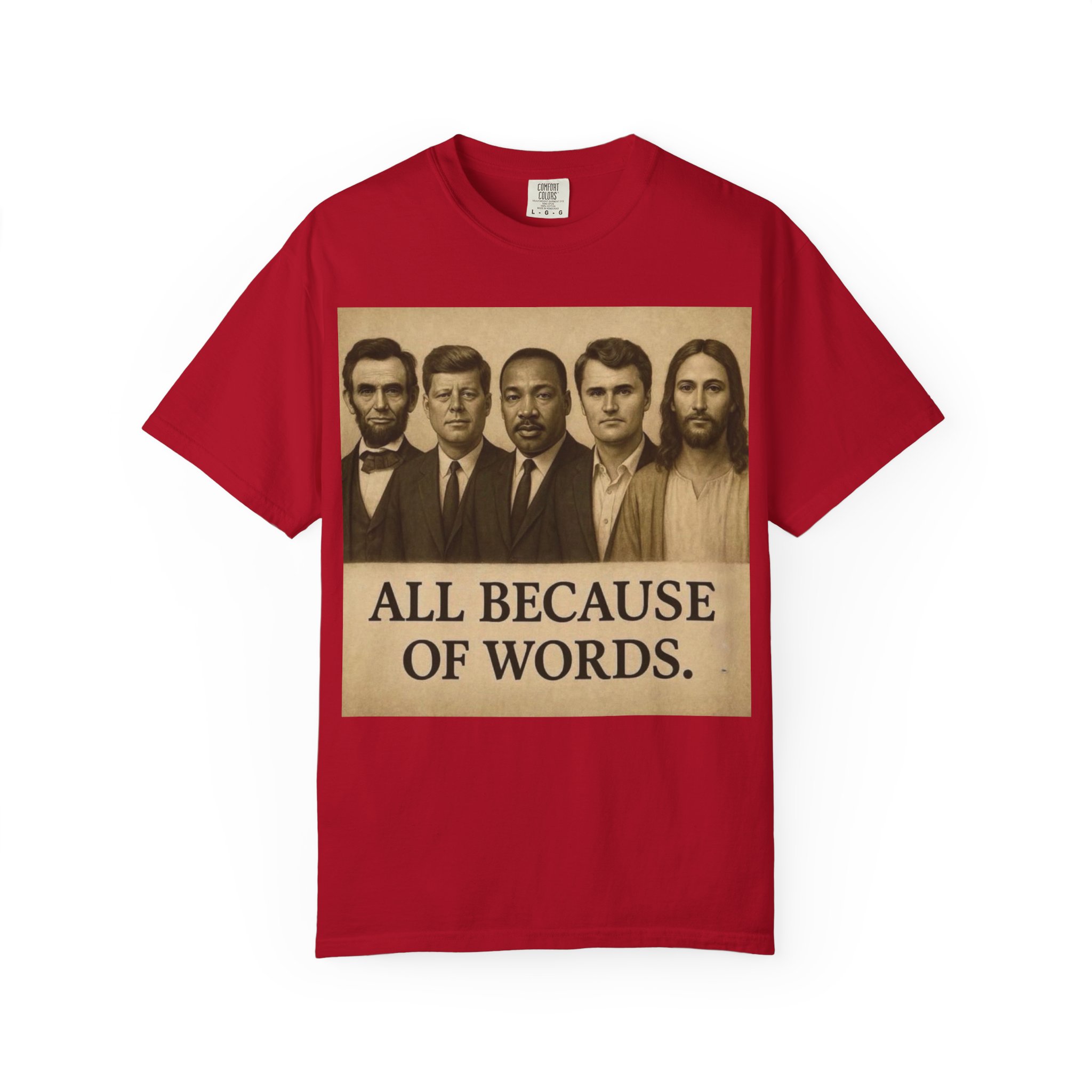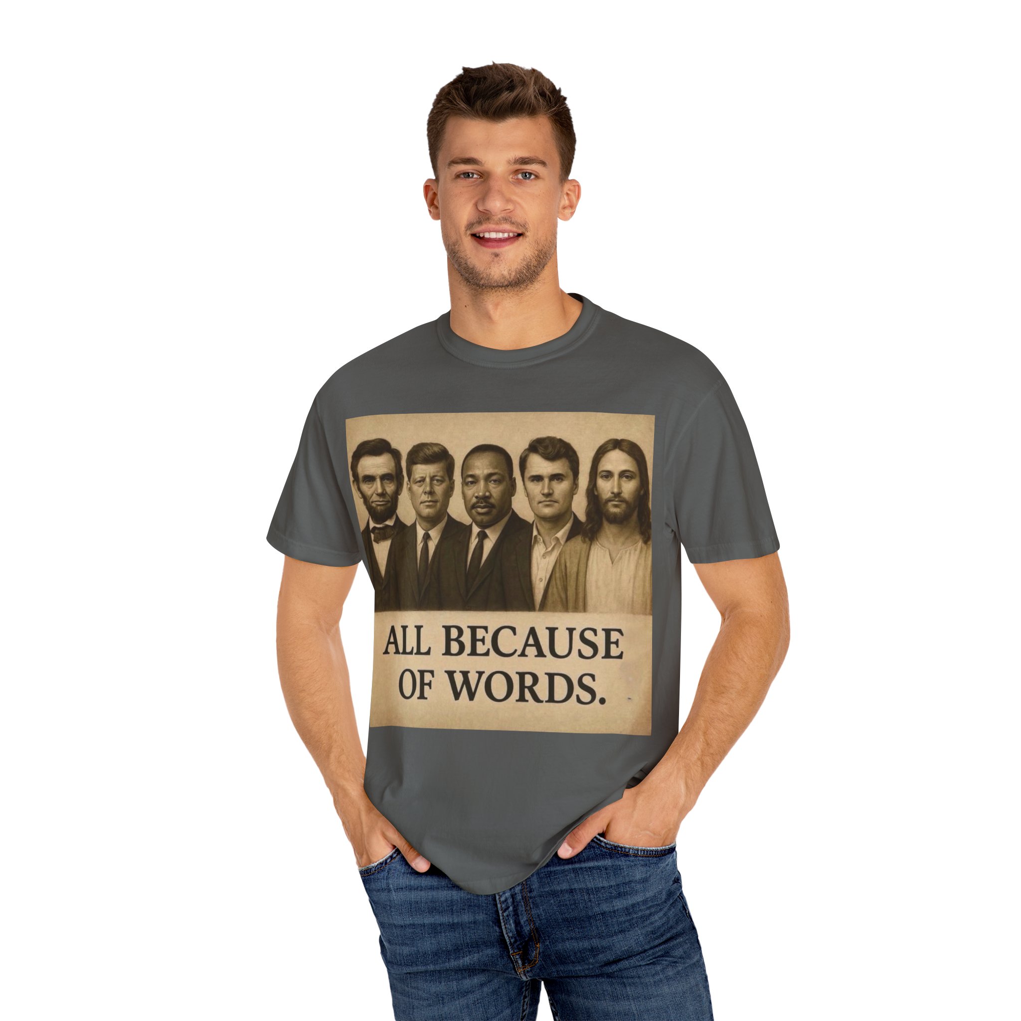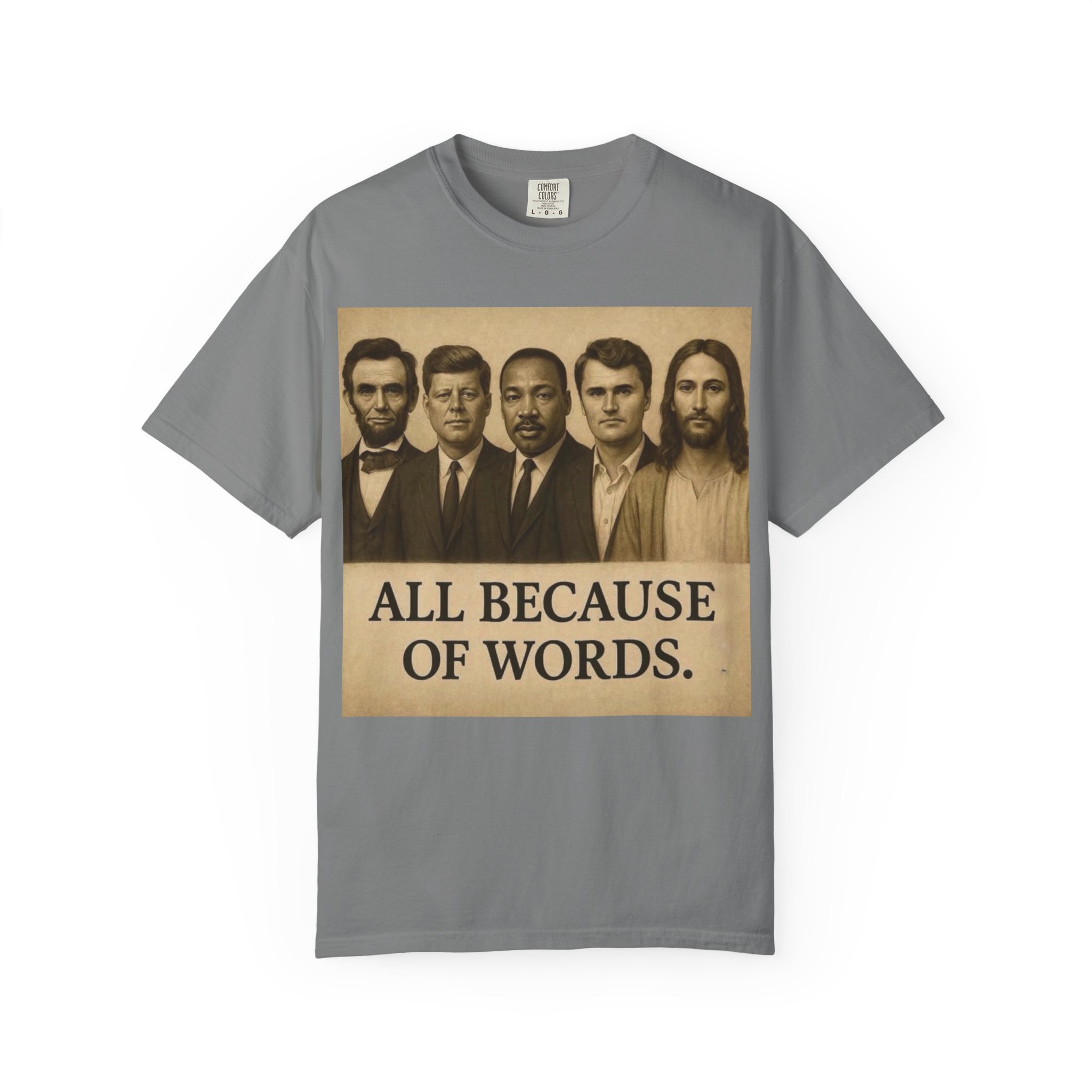 Make a bold statement with the “All Because of Words” T-shirt, designed for those who believe in the power of speech, truth, and leadership. Featuring a vintage-style sepia print with influential historical figures, this inspirational tee highlights the impact of words on history and culture.