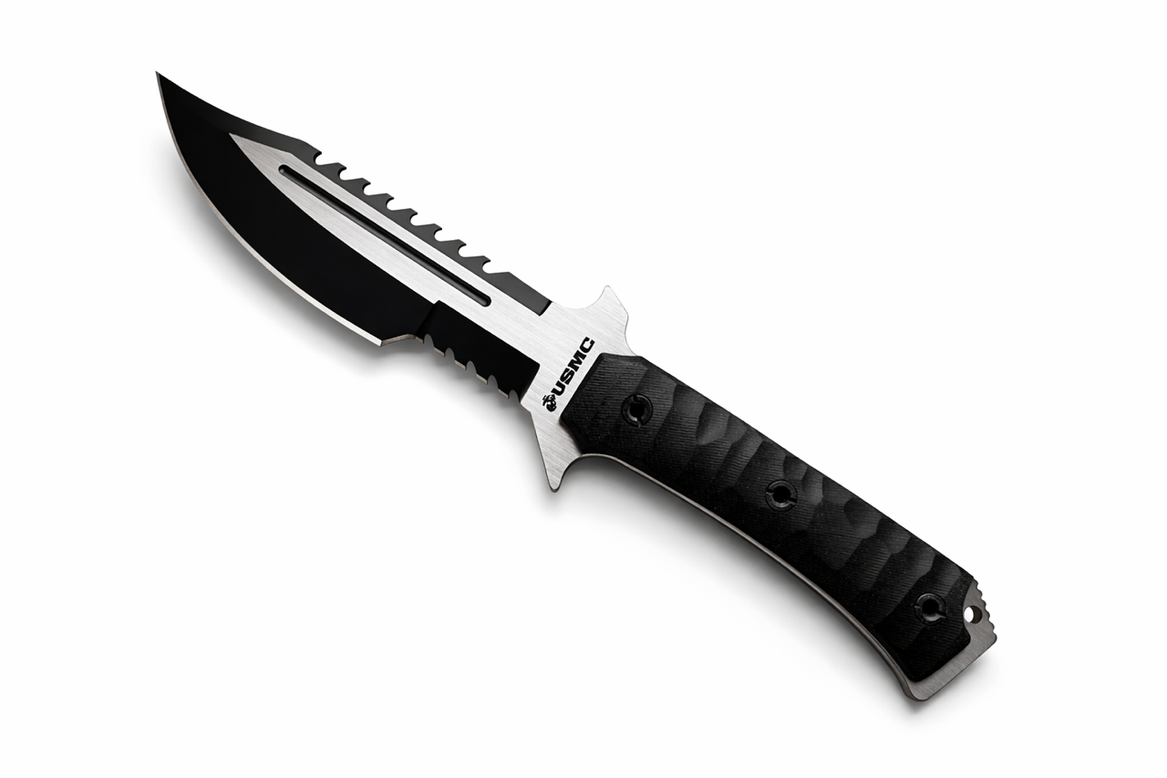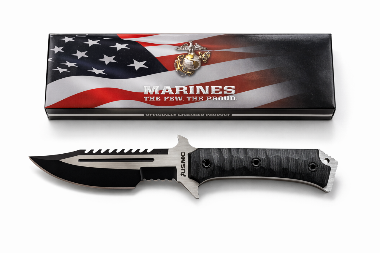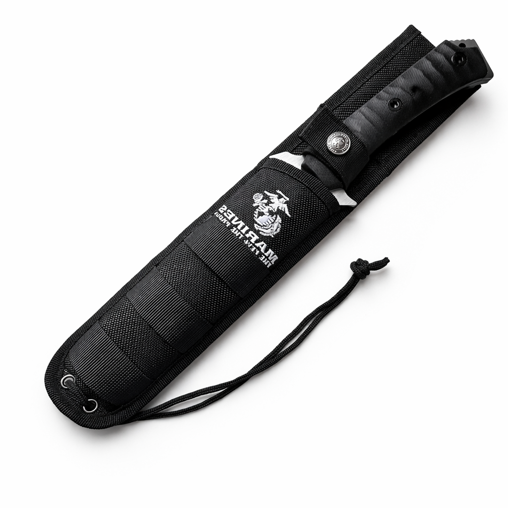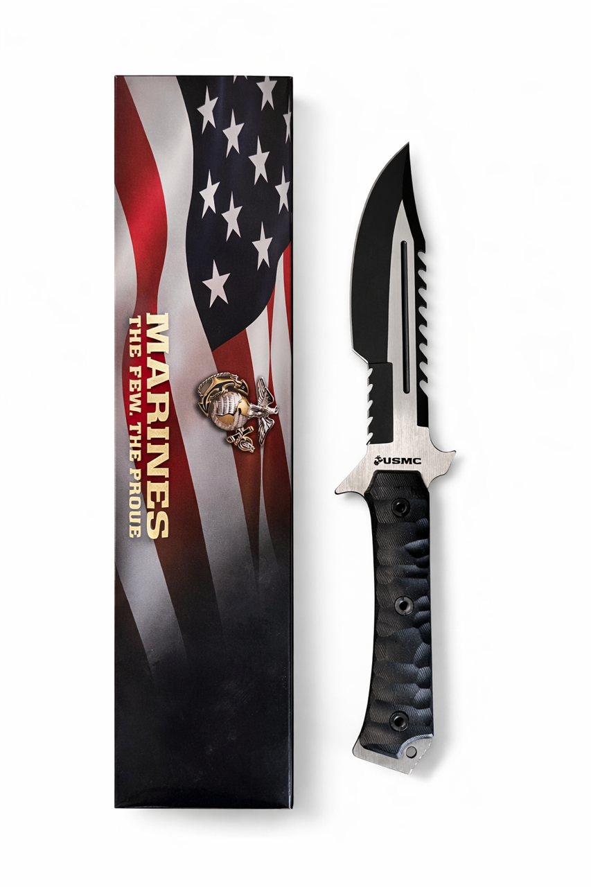 Honor the strength and precision of the United States Marine Corps with this USMC Survival Knife — built for toughness, versatility, and field performance. This full-tang fixed blade knife features a razor-sharp stainless steel blade with a sawback spine for cutting through rope, wood, and tough materials.