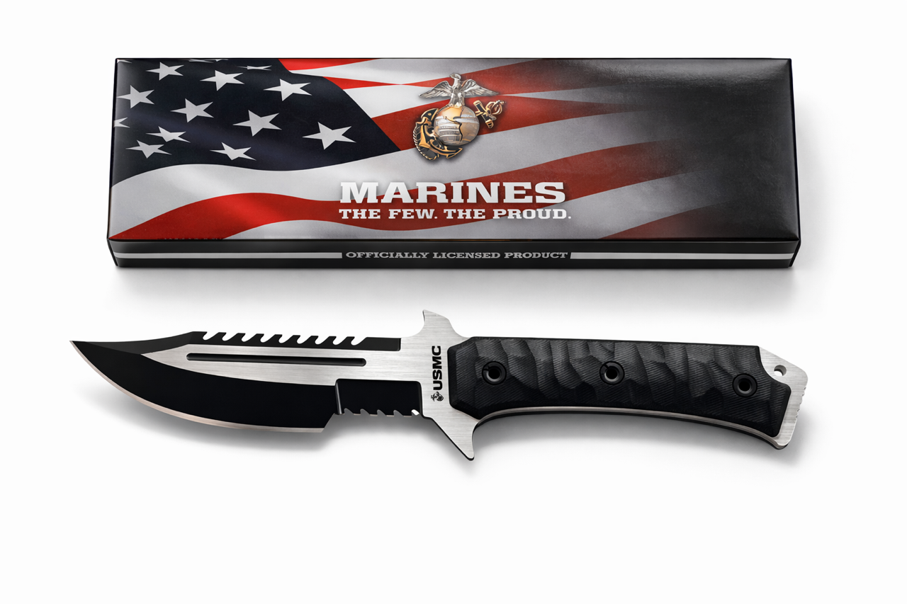 The ergonomic non-slip handle provides a secure grip in any condition, while the heavy-duty nylon sheath with the official USMC logo offers safe storage and quick access. Perfect for camping, hunting, survival, or display, this Marine-approved design delivers durability and dependability you can count on.